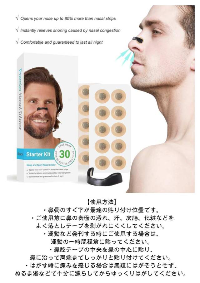 | 【鼻孔拡張グッズ】【30ペア】 鼻腔を広げて鼻スッキリ! スポーツでのパフォーマンス向上にも最適! 鼻腔を広げて呼吸を楽にします。 スポーツ選手なども幅広いシーンで使用しています。 成人のほとんどの方の鼻に適したサイズです。 【使用方法】 ・鼻骨のすぐ下が最適の貼り付け位置です。 ・ご使用前に鼻の表面の汚れ、汗、皮脂、化粧などをよく落としテープを剥がれにくくしてください。 ・運動など発刊する時にご使用する場合は、運動の一時間程前に貼ってください。 ・鼻腔テープの中央を鼻の中心に貼り、鼻に沿って両端までしっかりと貼り付けてください。 ・はがす時に痛みを感じる場合は無理にはがそうとせず、ぬるま湯などで十分に濡らしてからゆっくりはがしてください。 【ご注意】 ・過呼吸の方は使用しないでください。 ・お子様には使用しないでください。 ・傷、湿疹、日焼けなどの異常がある場合には使用しないでください。 ・絆創膏の刺激に弱い方は使用しないでください。 ・1日10時間以上続けて使用しないでください。 | |