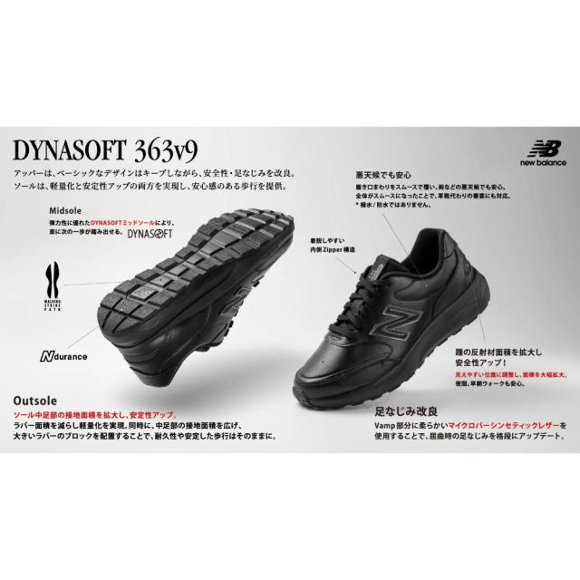 ワイドウイズで脱ぎ履きに便利なジッパー搭載のロングセラーモデル「DynaSoft 363 v9」に通気性の良いメッシュタイプが初登場。弾力性に優れたDYNASOFTミッドソールを採用し、アウトソールは中足部の接地面積広げることでより安定感を提供。かかとの反射材が早朝・夜間ウォーキングにも安心です。