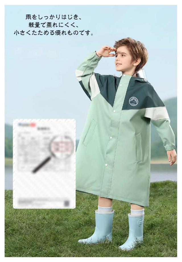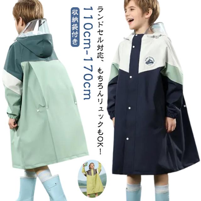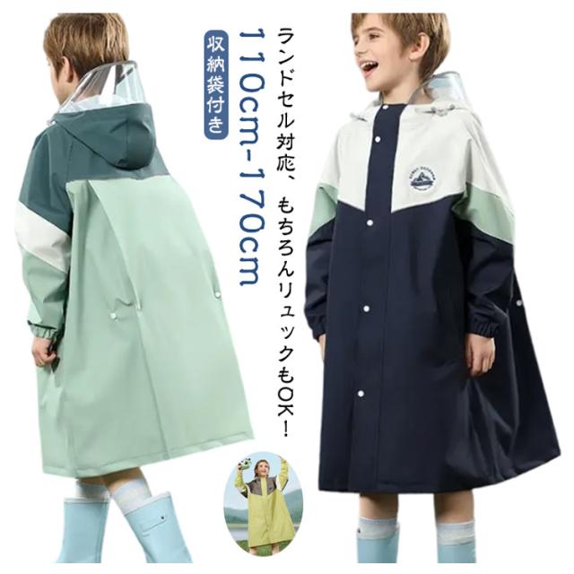 | ランドセル対応、もちろんリュックもOK!おしゃれな配色デザインのレインコート。【収納袋付き】【110cm−170cm】 ランドセルやリュックを背負ったまま着用できるので、荷物も雨から守ることができます。 雨をしっかりはじき、軽量で蒸れにくく、小さくたためる優れものです。 フード部分で視界を遮らないように、顔周りは透明になっています。 収納袋がついており、持ち運びにもピッタリ! 通学はもちろん、遠足や修学旅行の持ち物として持っておきたいアイテムです。 | |