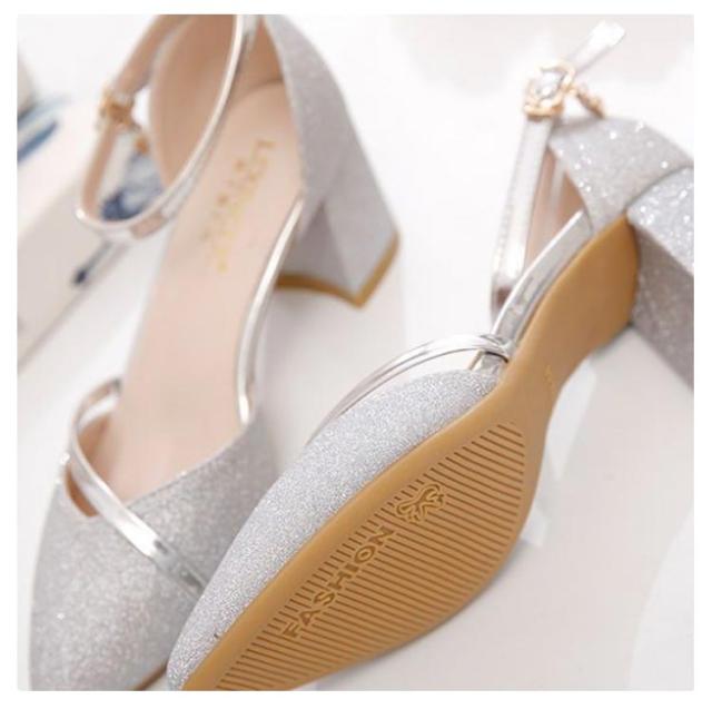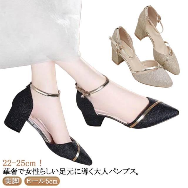 ストラップ パンプス シルバー 太いヒール パンプス アンクルストラップ ローヒール アーモンドトゥ ヒール5cm レディース 上品 ブラック ゴールド チャンキーヒール 結婚式 シューズ 発表会 キラキラ パーティー 綺麗め 靴 イベント 謝恩会 演奏会