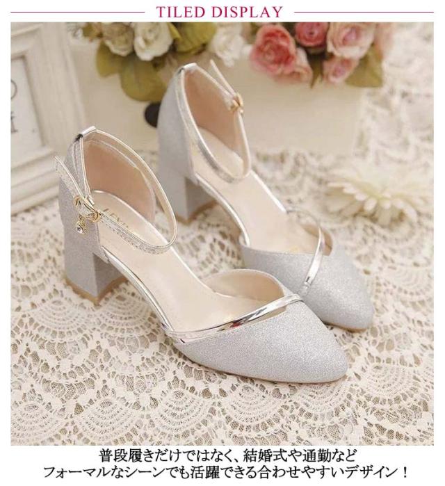 ヒール5.5cm キラキラ 結婚式 太いヒール アーモンドトゥ 発表会 レディース チャンキーヒール アンクルストラップ ローヒール 上品 シルバー ゴールド ブラック パンプス ピアノ パーティー 綺麗め ストラップ シューズ 靴 イベント 謝恩会 演奏会
