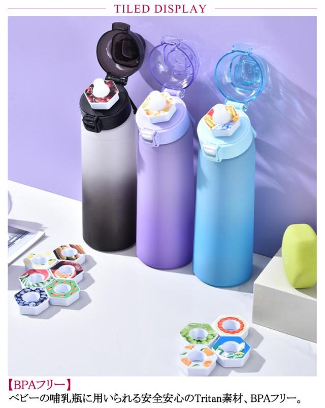 | 【ワンタッチで蓋が開く】ボタンを押すだけで瞬時に蓋が開き、飲み物を楽しむことができます。 【BPAフリー】ベビーの哺乳瓶に用いられる安全安心のTritan素材、BPAフリー。 【持ち手付き】持ち手付きで持ち運びはとても便利です。 【味のある水を飲んでいるように】味覚はすべて舌の味蕾に反映されていると考えていますが、実際には、舌は味覚体験の一部しか関与していません。嗅覚を使って味の源を反映することができます。この水グラスで水を飲んでも味はありませんが、嗅覚を使ってフレグランスリングがもたらす味を体験できるので、味のある水を飲んでいるように感じます。 【砂糖0%、カロリー0%、もっと楽しく】ワクワクする味を楽しみながら水を飲むだけです。 砂糖や化学薬品の添加を気にせずに、お好みの味をリフレッシュ。 飲料水の利点は全てありながら、より美味しい体験ができます。 【香り付きリング】エアアップウォーターボトルにはエアアップポッド、飲み物に自然な風味を加えることができます。 【漏れ防止&防塵】この水筒の蓋には、透明カバーと内部のシリコン製シールリングを使用し、防塵防滴に配慮しています。また、水筒がひっくり返っても漏れない安全ロック設計です。 このペットボトルをバックパック、自転車、旅行バッグに接続すると便利です。 旅行、ハイキング、ジム、すべての屋内外活動に最適です。 | |