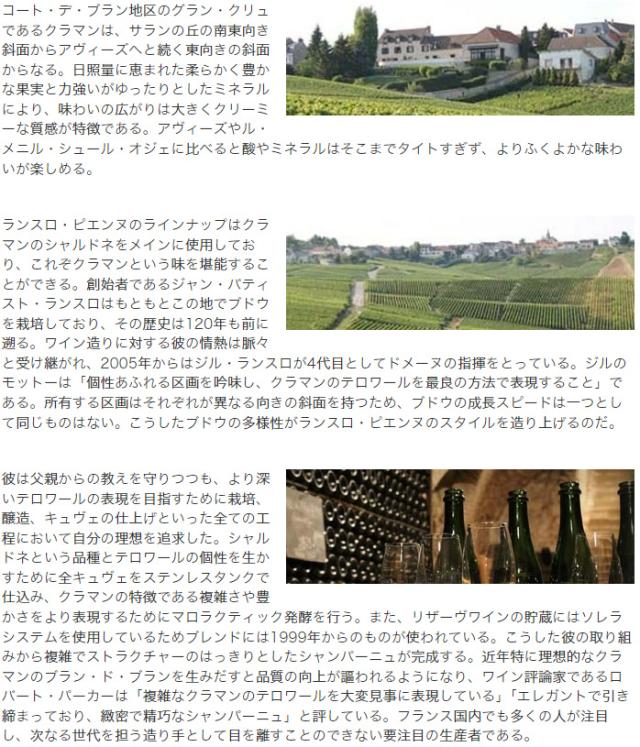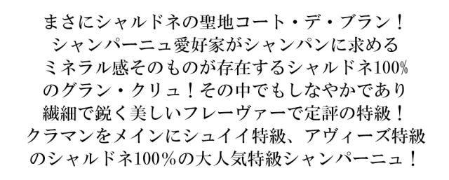 まさにシャルドネの聖地コート・デ・ブラン! シャンパーニュ愛好家がシャンパンに求める ミネラル感そのものが存在するシャルドネ100% のグラン・クリュ!その中でもしなやかであり 繊細で鋭く美しいフレーヴァーで定評の特級! クラマンをメインにシュイイ特級、アヴィーズ特級 のシャルドネ100%の大人気特級シャンパーニュ!