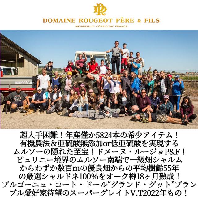 超入手困難!年産僅か5824本の希少アイテム!有機農法&亜硫酸無添加or低亜硫酸を実現するムルソーの隠れた至宝!ドメーヌ・ルージョP&F!ピュリニー境界のムルソー南端で一級畑シャルムからわずか数百mの優良畑からの平均樹齢55年 の厳選シャルドネ100%をオーク樽18ヶ月熟成!ブルゴーニュ・コート・ドール“グランド・グット”ブランブル愛好家待望のスーパーグレイトV.T2022年もの!