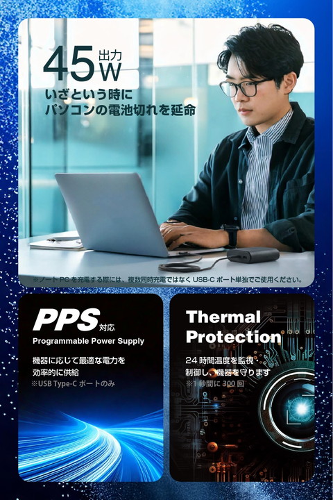 世界初!地球にも人にも優しいナトリウムイオン電池を採用したモバイルバッテリーです。雪山や砂漠など過酷な環境・温度でも使用可能。毎日使っても約13年間使える、5000サイクルの長寿命を実現。従来品と比べて発火の危険性が低い安全な電池だから、長く安心して使えます。 ※ナトリウムイオン電池を採用したモバイルバッテリー(製品)/量 9,000mAh・USB Type-C(TM)対応(45W出力・30W入力)に関する市場調査 「世界初」検証調査((株)未来トレンド研究機構調べ):2024年11月27日時点![]() ■地球に優しいナトリウムイオン電池を採用した、長く使える9000mAhのモバイルバッテリーです。 ■ナトリウムイオン電池はコバルト・リチウムなどを使用しないため、環境への負荷が少なく、安定供給を実現。持続可能な資源利用に貢献します。 ■-35℃〜50℃まで幅広い温度環境での使用に耐えうる仕様です。雪山や砂漠など過酷な環境・温度でも使用可能。スキー場や冬山などのマイナス環境でも充電できます。 ■※-35℃〜50℃は放電時の環境温度になります。接続機器や本製品の条件により出力が低下したり、出力が停止する場合もあります。 ■※本製品は防水、防塵仕様ではありません。 ■毎日使っても、約13年間使用可能な5000サイクルの長寿命を実現。耐久性が高く経済的です。 ※1サイクル=本製品の電池残量が100%から0%になるまで使用した場合 ■電池に釘を刺しても発火の可能性が少ない、安全性の高い電池です。 ■USB Power Delivery規格、PPS規格に対応。機器に応じて電圧、電流が変化するため、iPhoneなどのスマートフォンやiPadなどのタブレットはもちろん、ノートパソコンまで幅広く充電できます。 ■※USB Power Deliveryとは、アダプターと接続機器間で情報をやり取りすることで、その機器間における最適な電力を選択し、高速充電を実現するUSB規格です。PPS(Programmable Power Supply)とは、0.02V単位で電圧を調整し、最適な電力で効率的に供給することができるUSB Power Deliveryのオプション規格です。 ■USB Type-C(TM)ポートはUSB Power Deliveryに対応。最大45Wでの出力が可能です。充放電に優れているため、パソコンやNINTENDO SWITCH(TM)、NINTENDO SWITCH Lite(TM)などのゲームも充電可能です。 ■※NINTENDO SWITCH(TM)はドックでの利用に対応していません。 ■USB-Aポートからは最大18Wでの充電が可能。2ポート同時接続時も合計最大20Wでの出力ができ、iPhoneをはじめとしたスマートフォンやワイヤレスイヤホン、ヘッドセットなどの同時充電が可能です。 ■本製品(バッテリー容量9000mAh)で、1800mAhのスマートフォンを約2.9回、3000mAhのスマートフォンを約1.7回充電可能です。 ■※満充電した本製品で電源オフの状態のスマートフォンを充電する際の目安回数です。充電中に電源を入れたり、機器を使用したりしている場合は記載の数値まで充電できない場合があります。 ■本体充電用ケーブルを接続したままで、スマートフォンとモバイルバッテリーを充電できる“まとめて充電”に対応しています。 ■※スマートフォンへ優先的に充電されます。スマートフォンの充電が完了すると本製品に充電されます。接続機器によっては本製品への充電が優先され、機器への充電に時間がかかる場合があります。 ■高性能ICが接続機器を自動で見分けて最適な出力で最速に充電できる“おまかせ充電”に対応しています。 ※USB-Aポートのみ ■Bluetooth(R)ヘッドセット・イヤホンなどの充電電流の小さい小型電子機器を最適な電流で充電することができる低電流モードを搭載しています。 ※USB-Aポートのみ ■本製品は約2時間で充電できます。 ■※本製品のみを充電した場合の目安時間です。 ■電池残量は4段階のLEDランプ点灯で確認可能です。 ■ナトリウムイオン製品は日本の電気用品安全法(PSE)対象外の製品ですが、PSEの技術基準に適合したリチウムイオンと同等の安全性を確認しています。 ■Thermal Protectionを搭載し、製品温度の上昇を24時間監視・制御。自動で出力をコントロールし、お使いの機器を守ります。 ■過充電・過放電・過電流防止機能および短絡保護機能と温度検知機能の5つの保護機能を備えた安心の回路設計です。 ■電池容量が160Wh(43,243mAh)以下であるため、機内持ち込みも可能です。 ■※航空会社の規定によって例外がある場合があります。 ■※工場出荷時に70%程度充電されています。充電式ナトリウムイオン電池は時間とともに放電するので、ご使用になる前に充電することを推奨します。 ■※充電ケーブルは同梱しておりません。別途ご購入またはご用意ください。 ■※ケーブルを挿したままにするとバッテリーの残量が減ってしまいます。使用しない場合は必ずケーブルを外してください。 ■環境負荷の低い、プラスチックレスパッケージを実現しています。 ■※USB Type-C and USB-C are trademarks of USB Implementers Forum. ■※本製品を廃棄するときは、地方自治体の条例に従ってください。条例の内容については、各地方自治体にお問い合わせください。 ■自社環境認定