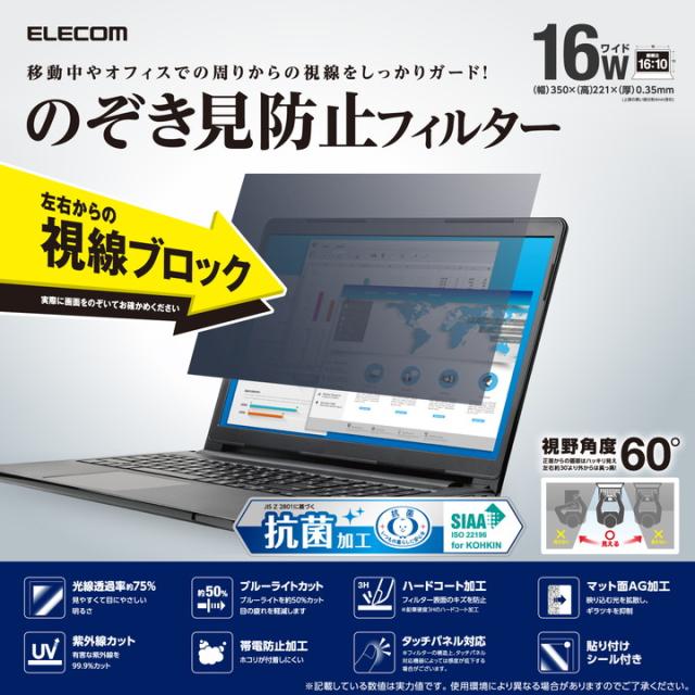 エレコム 液晶保護フィルター のぞき見防止 フィルタ 抗菌 ノートPC 16Wインチ(16:10) ┃EF-PFK16W10