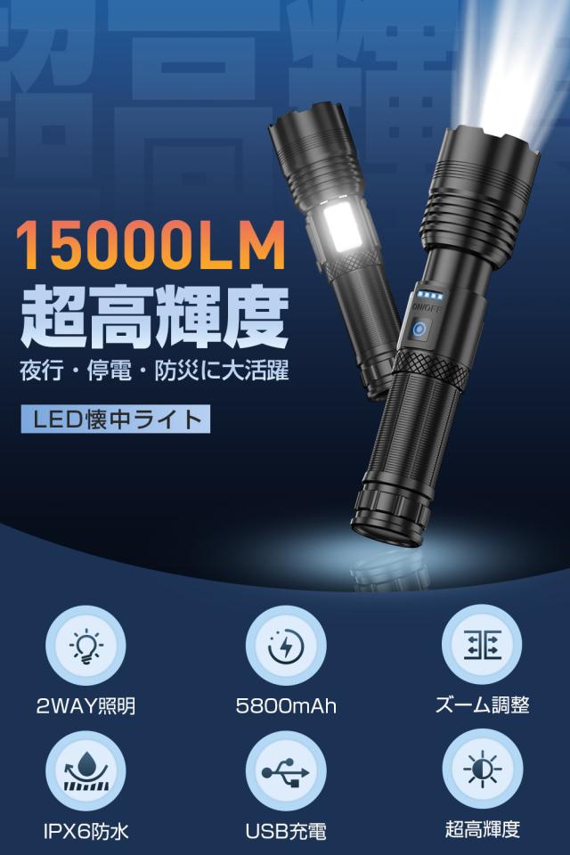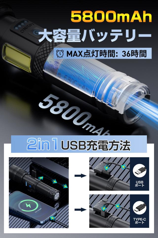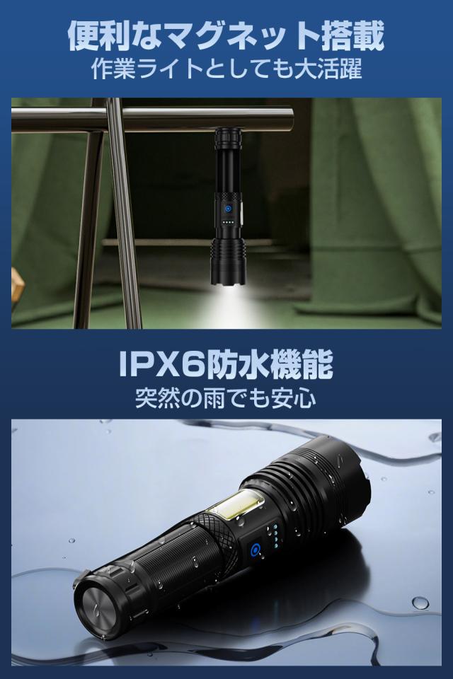 【XHP160LED&マグネット付き】懐中電灯 ledライト 強力 フラッシュライト 大容量5800mAh Type-C 充電/電池式 ハンディライト IPX6防水 ズーム調整 7照明モード