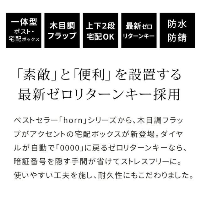 ベストセラー「horn」シリーズから、木目調フラップがアクセントの宅配ボックスが新登場。ダイヤルが自動で「0000」に戻るゼロリターンキーなら、暗証番号を隠す手間が省けてストレスフリーに。使いやすい工夫を施し、耐久性にもこだわりました。