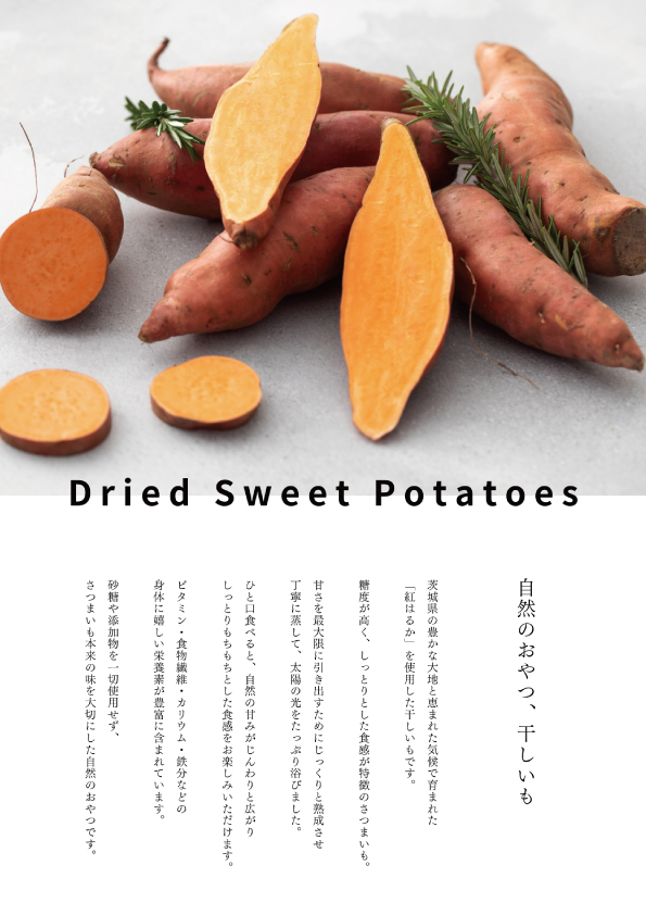 茨城県の豊かな大地と恵まれた気候で育まれた「紅はるか」を使った干し芋です。 紅はるかは、糖度が高く、しっとりとした食感が特徴のさつまいも。 その甘さを最大限に引き出すために、じっくりと熟成させた後、丁寧に蒸して天日干ししました。