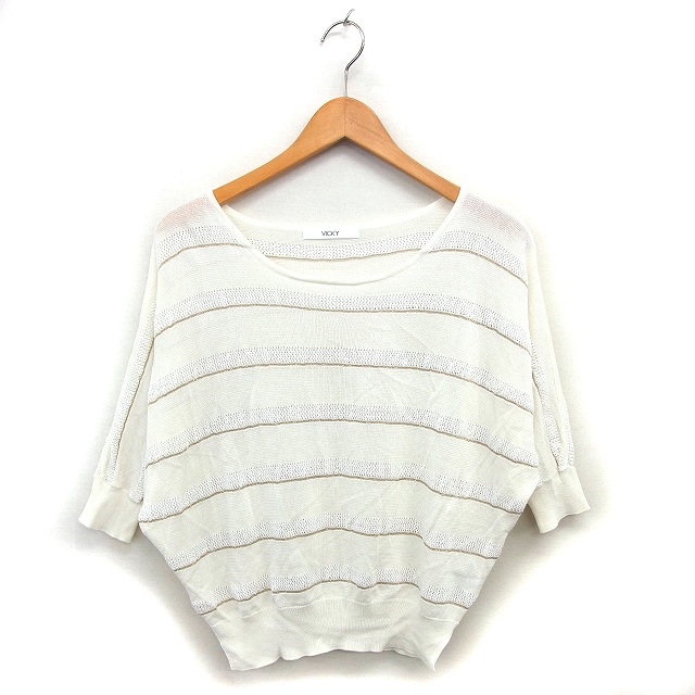 【中古】ビッキー VICKY サマーニット セーター ボーダー ドルマンスリーブ コットン混 クロップド 透け感 七分袖 2