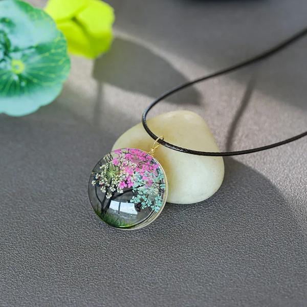 女性のための天然ドライフラワーの木のペンダントネックレス,透明な樹脂のボールが付いた丸い宝石