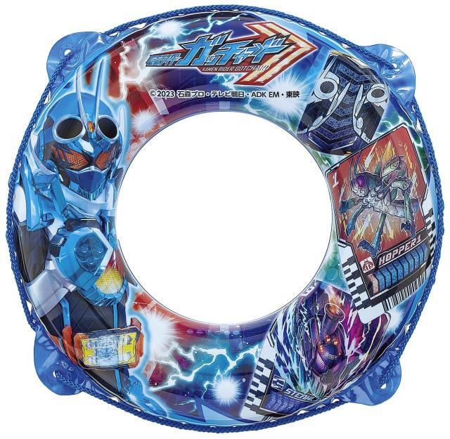 大人気仮面ライダーガッチャードの浮輪です。直径55センチで対象年齢は3〜6歳くらいのお子様です。ロープ付き。かんたん空気栓装着商品