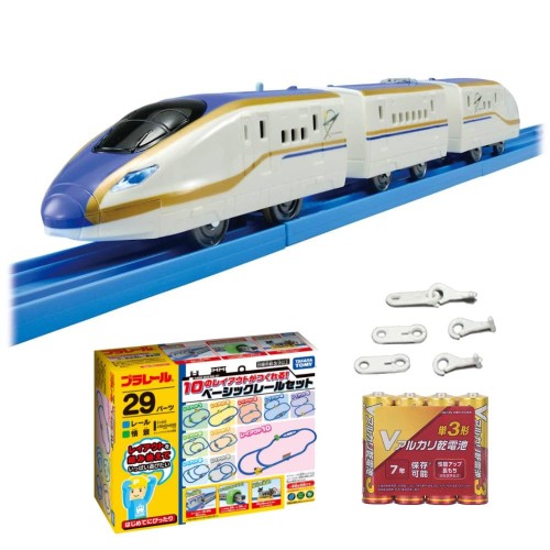 プラレール セット S-05 ライト付E7系新幹線かがやき&10のレイアウトがつくれる!レールベーシックセット&単3形アルカリ電池4本&予備連結パーツセット