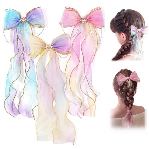SNS映え間違いなし大人気のゆめかわチュールリボンです?透け感のある、ふわっとした優しい印象のオーガンジー素材♪ パールのビジューとチェーンもついて、ゴージャスかつエレガントな雰囲気です☆ ヘアクリップ式クリップになっているので脱着も簡単♪ とってもcuteなヘアアクセ! 綺麗なグラデーションのリボンがまるでプリンセス♪ 髪と一緒に編み込んだりヘアアレンジが多様にできるのが特徴です。 そのままつけても揺れるリボンがとっても可愛いです♪ お子様のヘアアレンジが簡単に簡単に仕上がります♪ さまざまなシーンに最適発表会、誕生日や成人式などの大切な日はもちろん、プリンセスの衣装のヘアアクセサリーとしてもピッタリ!ご家族やお友達とのお揃いもオススメです☆ お得な3個セット編み込み可愛らしい大きめの存在感バッチリのリボンを3個付属しております。 商品保証:品質には万全を期しておりますが、万が一、個別の商品は問題がございましたらご連絡を頂けると迅速に対応致します。お客様にご満足頂けるように全力を尽くしたいと思っております。