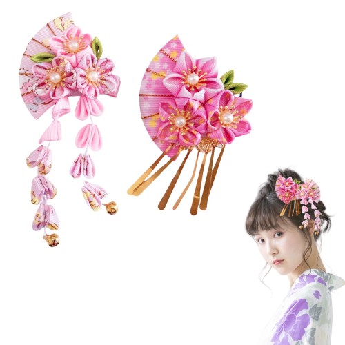 和装 髪飾り 扇型 2点セット ヘアクリップ 花 中華風 漢服 浴衣 和装 ヘアアクセサリー ヘッドドレス 子供髪飾り 入学式 卒業式 七五三 夏祭り 花火大会 (ピンク)