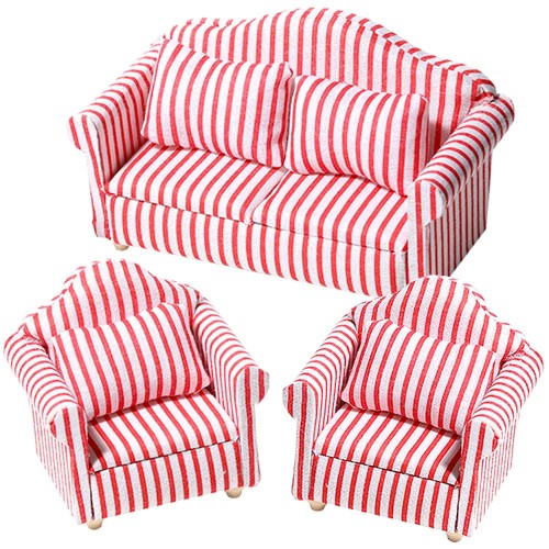 moin moin ミニチュア 1/12 スケール 家具 ソファ 3点セット B品 訳アリ/ドールハウス 二人掛け 一人掛け シングル クッション ホワイト 赤 レッド ストライプ 布 ファブリック ドール 人形 雑貨 2306mini15