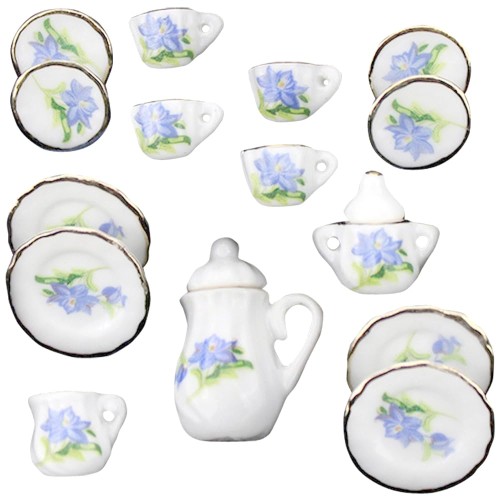 moin moin ミニチュア 1/12 スケール ドールハウス 食器 器 15点セット 陶器 皿 プレート 小物 飾り インテリア 花 ブルー 百合 リリー 青 カトラリー ポット ティー コーヒー カップ ソーサー ピッチャー ドール 人形 ゴールド ライン 雑貨 2406mini38