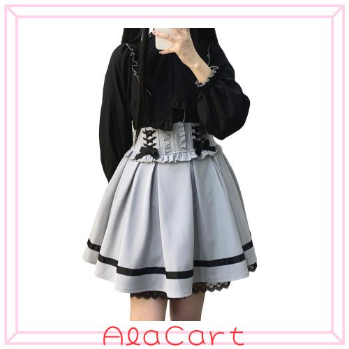 ?【レースアップ】ウエストの部分はレースアップデザインで可愛い?大きめリボンも付いていて華やかさがUP。ハイウエスト&Aラインのデザインで、ウエストが細見え、足長効果も抜群です。