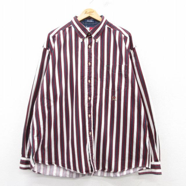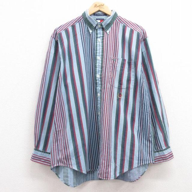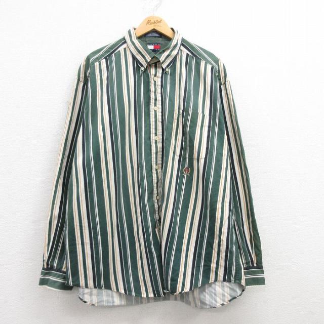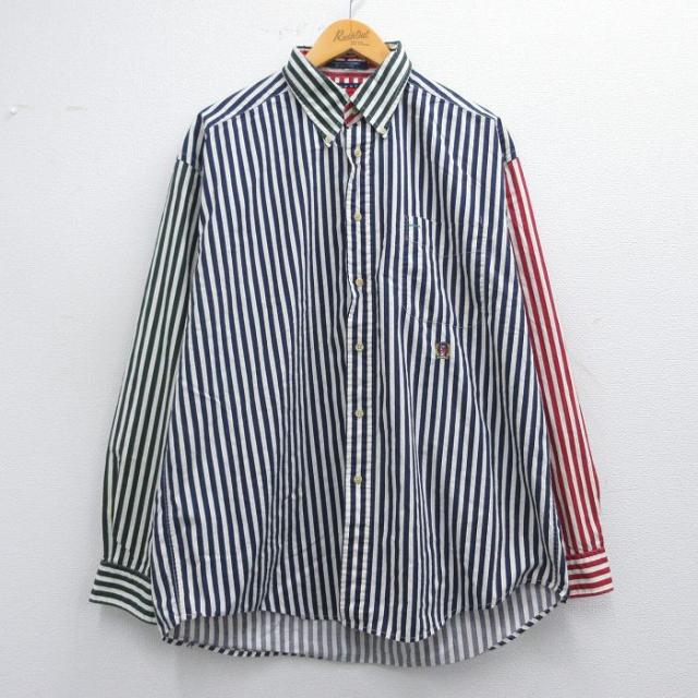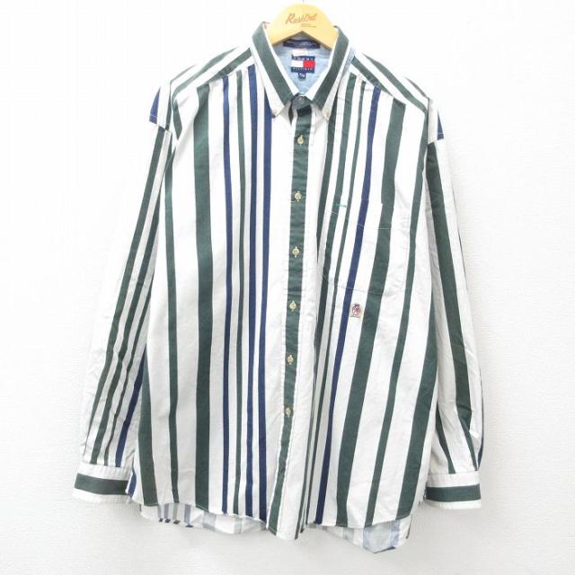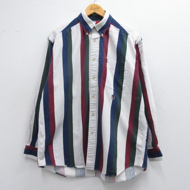 【商品名】 XL★古着 トミーヒルフィガー 長袖 ブランド シャツ メンズ 90年代 90s マルチカラー ワンポイントロゴ ロゴ コットン ボタンダウン 白他 ストライプ【spe】