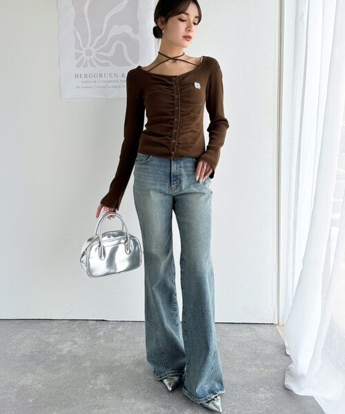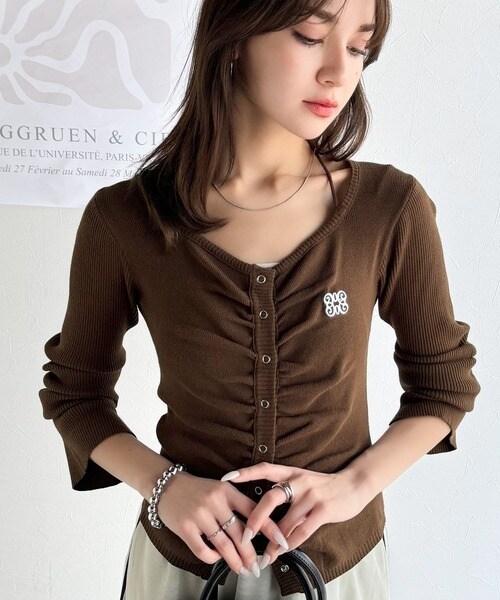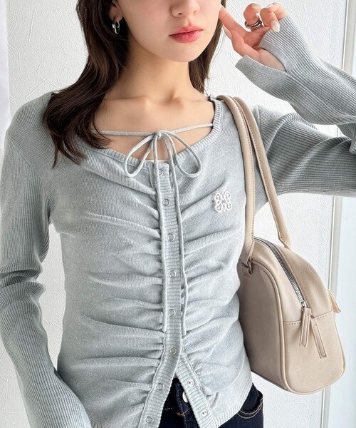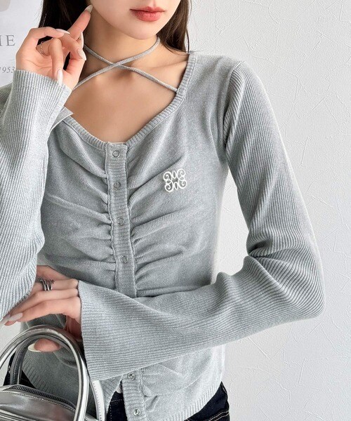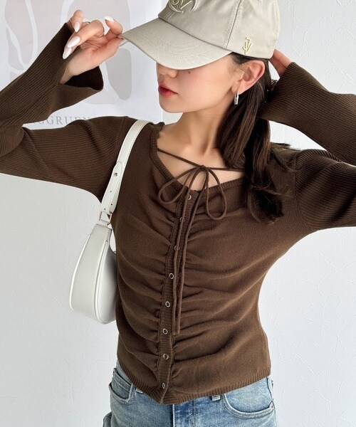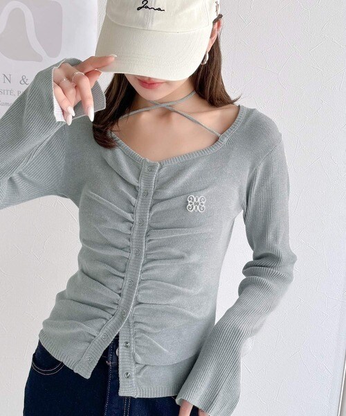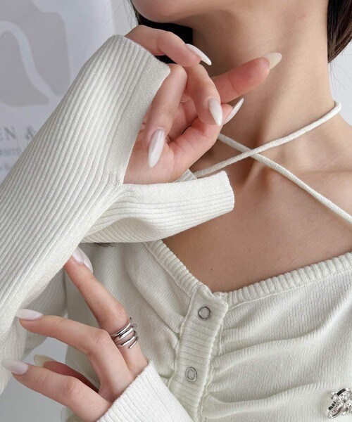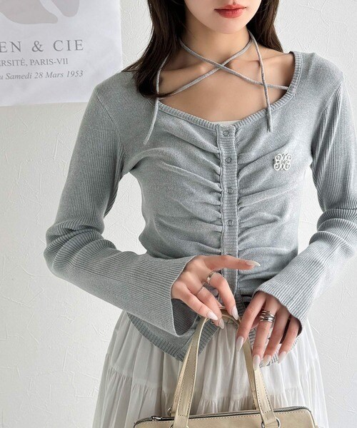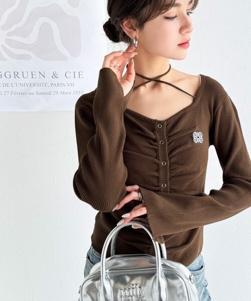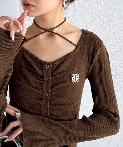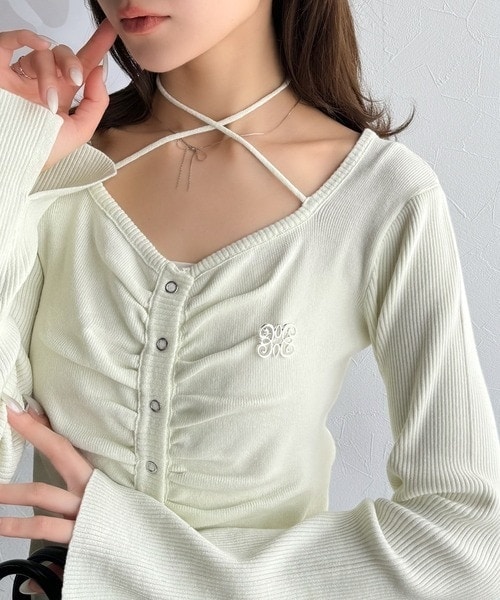 【mily bilet】チョーカー紐&ブローチ付き胸シャーリングニットプルオーバー(長袖)