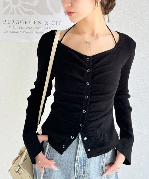 胸元のシャーリングで胸元キレイ見せ効果の洗練ニット。