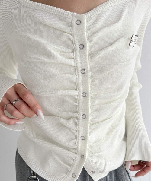 デコルテを美しく見せる胸シャーリングデザインのニットトップス。
