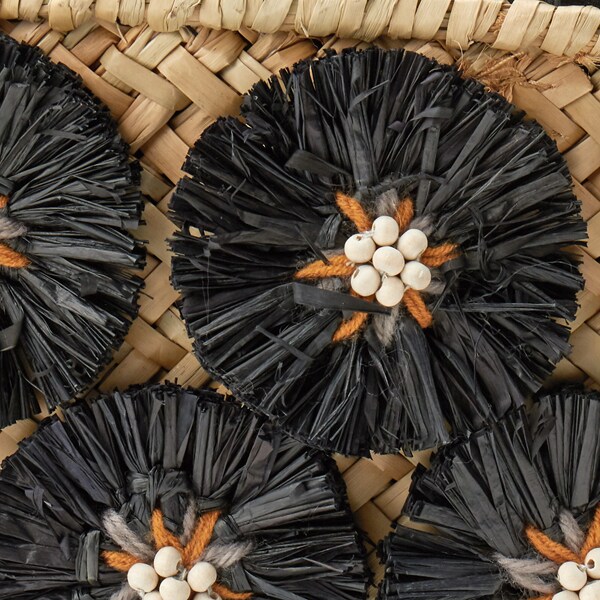水草かごにラフィアのお花をあしらったカゴバッグ。