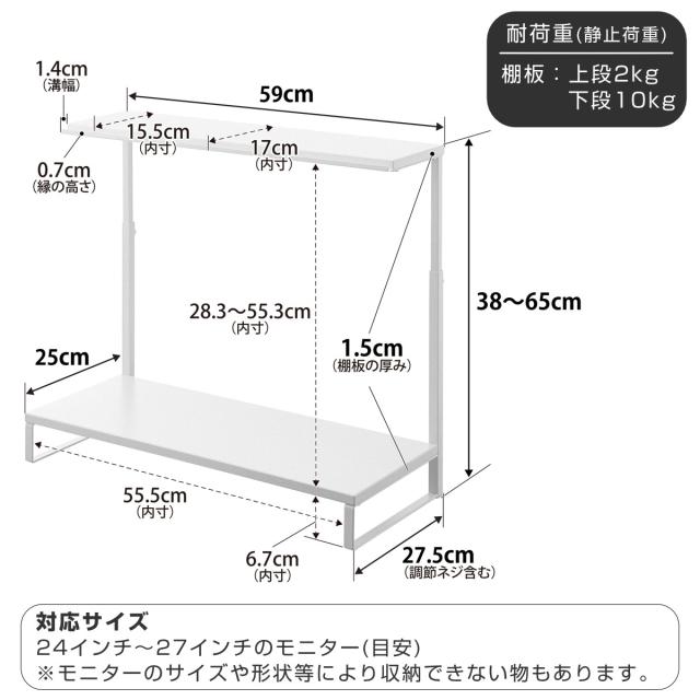 | サイズ | 外寸:約 幅59×奥行27.5×高さ38〜65(cm) 調節ねじ含む 上段:約 幅59×奥行17(cm) 下段:約 幅59×奥行25×高さ28.3〜55.3(cm) |