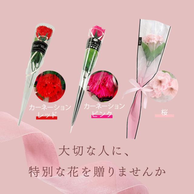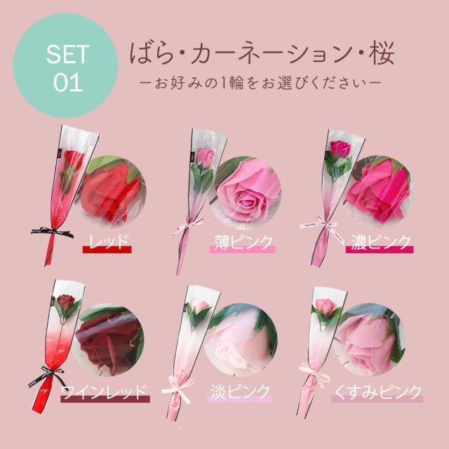 6種類のバラ、2種のカーネーション、桜…ギフトシーンに合わせてお好みの一輪をお選びいただけます。