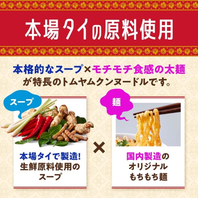 ●本場タイの本格感を再現する酸味(レモングラス等)・辛み(唐辛子等)・甘み(たまねぎ等)の美味しさが詰まったスープが、モチモチとした食べ応えのある麺と食べられる、本格トムヤムクンヌードルです。