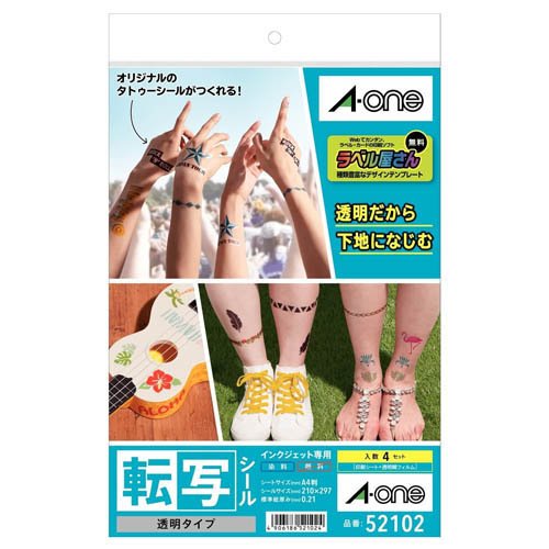エーワン 転写シール タトゥシール インクジェット 染料 透明 A4 52102(4セット入)[コピー用紙]