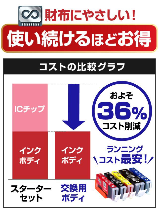 | 繰り返し使える永久ICチップ付きの互換インクカートリッジです。インクが無くなった際は、インクボディのみ(ICチップなし)を追加でご購入いただき、永久ICチップを付け替えることで、ご使用いただけます。 永久ICチップを繰り返し使用することでコストを削減し、環境にも経済的にも優しい商品です。ぜひお試しください。 |