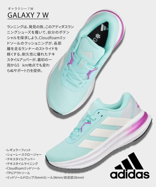 アディダス ランニングシューズ レディース 白 ギャラクシー 7 メッシュアッパー カジュアル スポーツ ウォーキング フィットネス ジム トレーニング 部活 陸上 トラック 軽量 運動靴 紐靴 クッション ホワイト ブルー adidas GALAXY 7 W ID8762 JI4607 JS0587