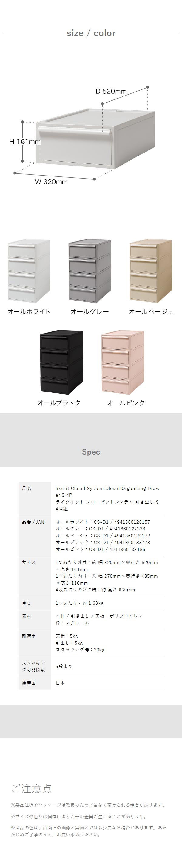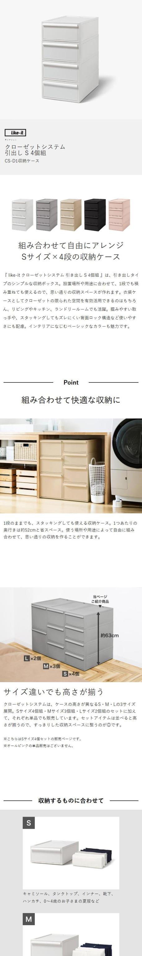 [ like-it クローゼットシステム 引出し S 4個組 ]収納ケース 引き出し 収納ボックス 収納 クローゼット 衣装ケース ライクイット 積み重ね スタッキング 衣類収納 洋服 ケース 日本製 押入れ 服 シンプル 新生活 リビング キッチン CS-D1