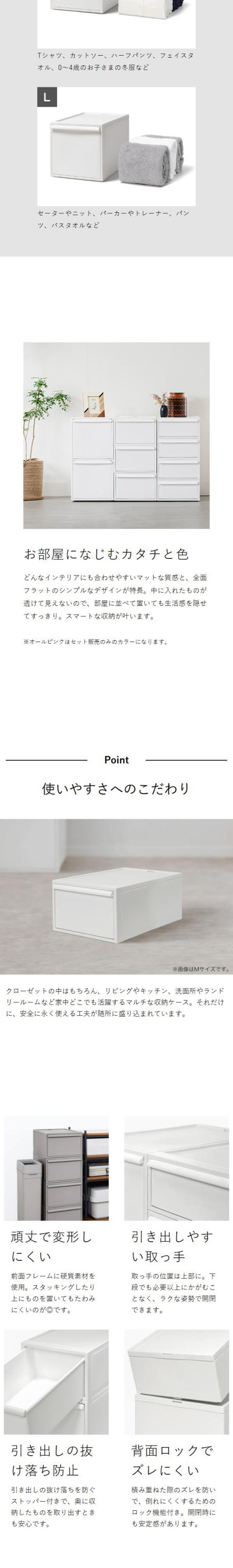 積み重ねて使える引き出しタイプの収納ボックス。衣装ケースとしてクローゼットで活躍。掴みやすい取っ手やスタッキングしてもズレにくい背面ロック構造。インテリアになじむカラーです。