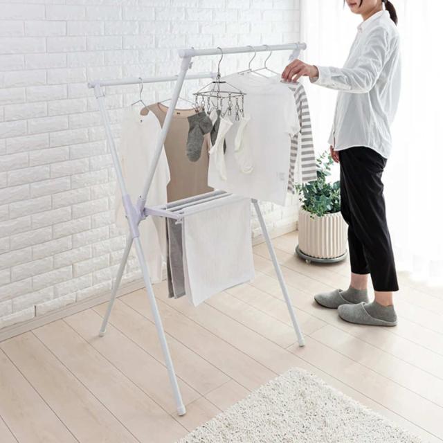 シンプルで使いやすいX型物干しスタンドです。お部屋に馴染みやすいホワイトカラーです。通気性の良い段違い設計なので、省スペースで効率良く干せます。組み立ては工具不要の簡単設計なのもポイントです。