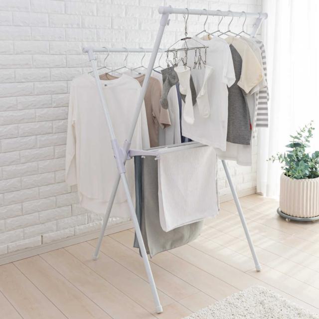 シンプルで使いやすいX型物干しスタンドです。お部屋に馴染みやすいホワイトカラーです。通気性の良い段違い設計なので、省スペースで効率良く干せます。組み立ては工具不要の簡単設計なのもポイントです。