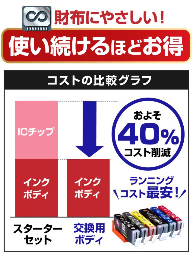 | 繰り返し使える永久ICチップ付きの互換インクカートリッジです。インクが無くなった際は、インクボディのみ(ICチップなし)を追加でご購入いただき、永久ICチップを付け替えることで、ご使用いただけます。 永久ICチップを繰り返し使用することでコストを削減し、環境にも経済的にも優しい商品です。ぜひお試しください。 |