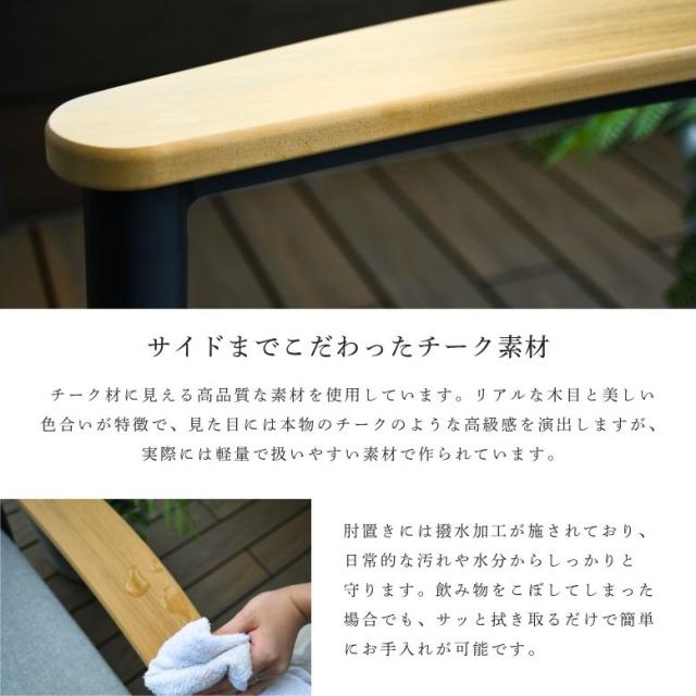 ・チェア、ソファの肘置きはまるで本物のようなチーク色プラスチック木材。
