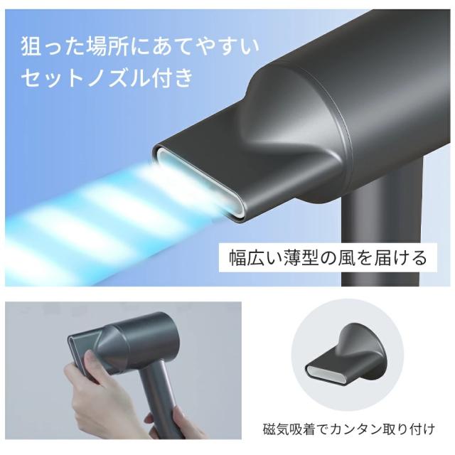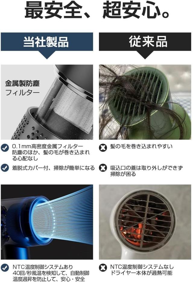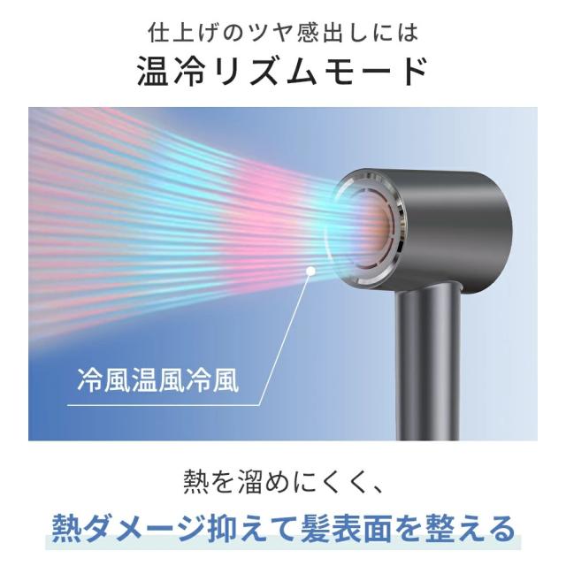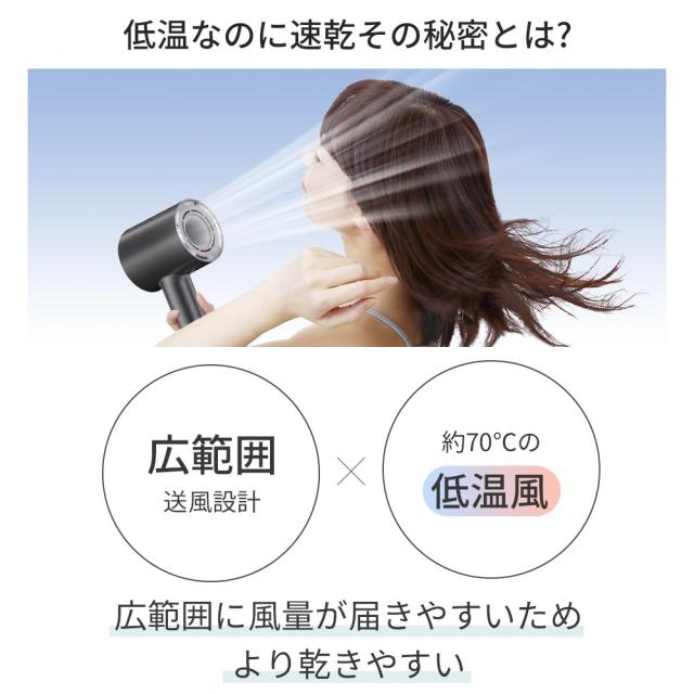 【自宅でサロンのような仕上がりを再現】「速く乾かす」、「髪にやさしい」、「髪のダメージを防ぐ」、「頭皮にやさしい」などヘアドライヤーに対するすべての期待を叶える美髪速乾ドライヤーが誕生!110,000rpmの高速ブラシレスモーターを採用し、23m/s圧倒的な風速&2.6m?/分の大風量を実現!!従来品より約50%のドライ時間を短縮し、最短1分間で速乾可能で、ドライ時の熱ダメージを回避できる髪に優しい 大風量 ドライヤー !