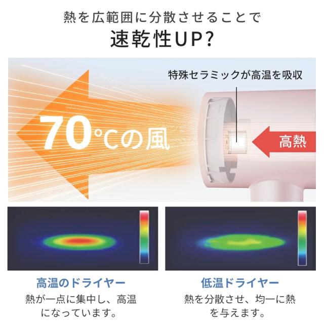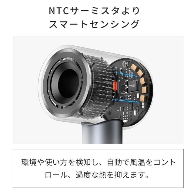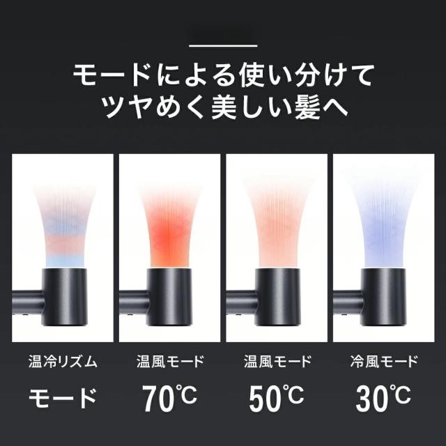 【風温・風速調節可能&温度過昇防止】4段階温度[30℃・50℃・70℃・温冷リズム]x2段階風速[弱・強]の組み合わせで全8通りの風をカスタマイズ可能、自分好みの質感やスタイルに仕上げることができます。メモリー機能も搭載、前回使用のモード・風量を記憶して、毎回の設定は不要で便利です。また、NTC温度センサーが内蔵され、40回/秒で温度を検知して、リアルタイムで風温をコントロールし温度過昇をを防ぎ、安全・安心にお使いいただけます。