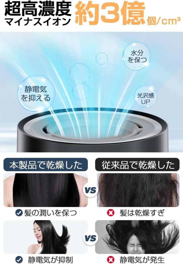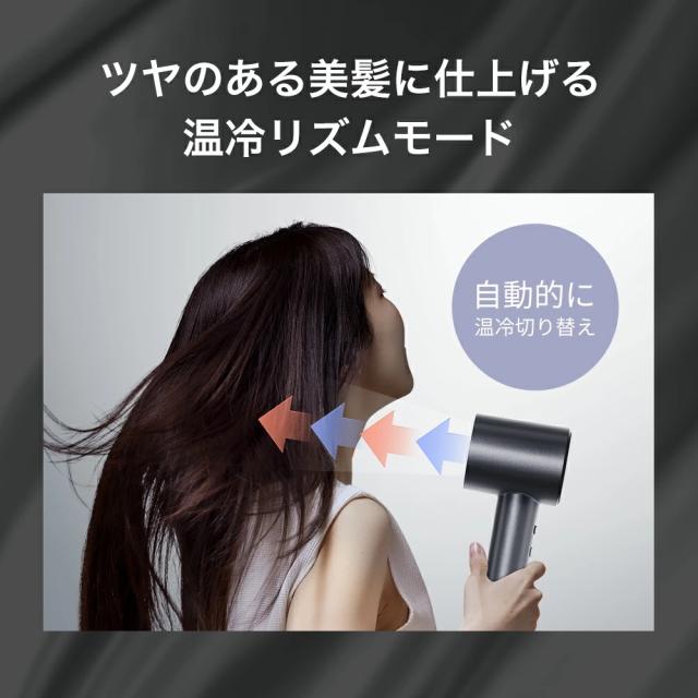 【髪を乾かしながらヘアケア &ツヤツヤ髪へ】3億個の超高濃度マイナスイオンを含んだ風で、髪や頭皮(地肌)の潤いを守り、静電気防止 、健やかでツヤのある髪へ導きます!!また、温風と冷風を一定の間隔で自動に切替える「温冷自動切替モード」を搭載、髪表面が熱くなりすぎる前に冷ますことができ、髪のうねりや広がりを抑えてまとまりのある髪と、ツヤ感がさらにアップ!速乾x美髪を両立したヘアドライヤーです。