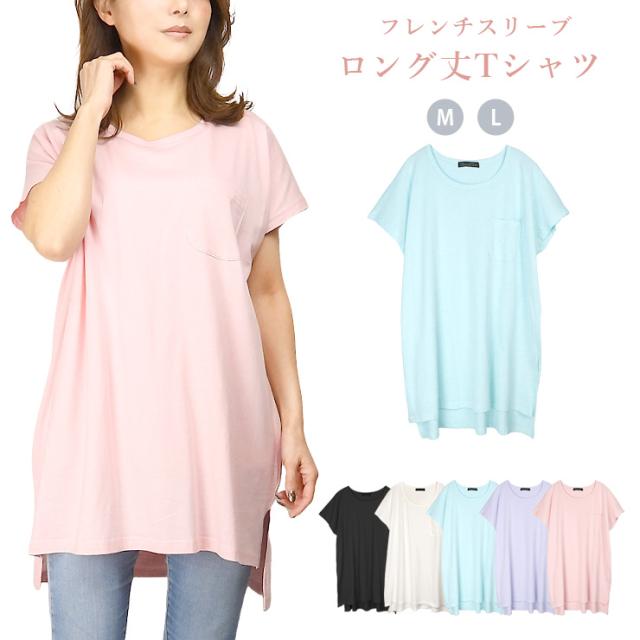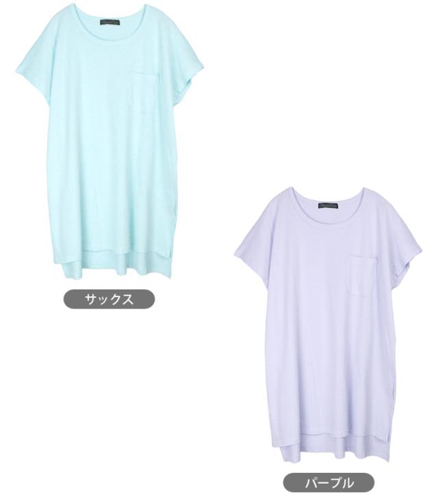 【メール便送料無料】フレンチスリーブ 半袖 BIG Tシャツ M L レディース ブラック ホワイト サックス パープル ピンク YN24-103-2 シンプル 無地 カットソー トップス 綿100% コットン100% クルーネック 胸ポケット 半そで フレンチ袖 黒 白 青 紫 ブル— 2855