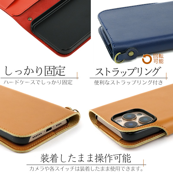 | 上質な牛革を全面に使用した、牛革手帳型ケース。 美しい質感と滑らかな触り心地の牛革を使用しています。 一つ一つ丁寧に制作しています。 実用新案登録済のカード落下防止フラップ付き! 逆さにしてもカード落下の心配がありません。 大切なカード収納時やネックストラップ使用時などに最適です。 内部ケースはハードケースなのでしっかりとスマートフォンを固定できます。 横開きタイプなので、手帳のように使うことができます。 また、内側にはカードポケット2つとフロント/サイドポケットが付いています。 しっかりと固定できるマグネット式スナップボタンを採用しています。 便利なストラップリング付きで、ストラップなどを装着可能です。 | ||||||||||||||