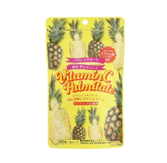 バランスサポートビタミンCパルミテートは、ご家族の皆様で美味しく召し上がっていただけるパイナップル風味のビタミンC粒です。DSM社製のビタミンCパルミテートを使用しており、一般的な水溶性ビタミンCとは異なり、脂溶性のビタミンC誘導体のため、通常のビタミンCよりも長時間にわたって体内に滞在しやすいビタミンCとして注目されています。