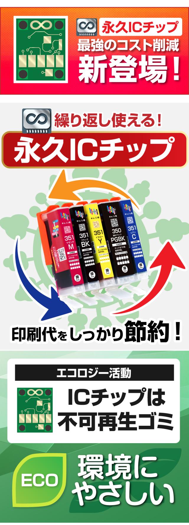 | 繰り返し使える永久ICチップ付きの互換インクカートリッジです。インクが無くなった際は、インクボディのみ(ICチップなし)を追加でご購入いただき、永久ICチップを付け替えることで、ご使用いただけます。 永久ICチップを繰り返し使用することでコストを削減し、環境にも経済的にも優しい商品です。ぜひお試しください。 |