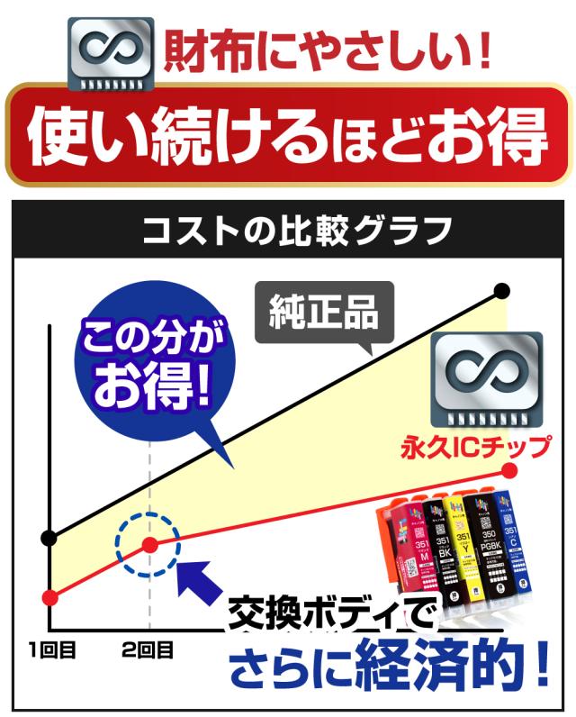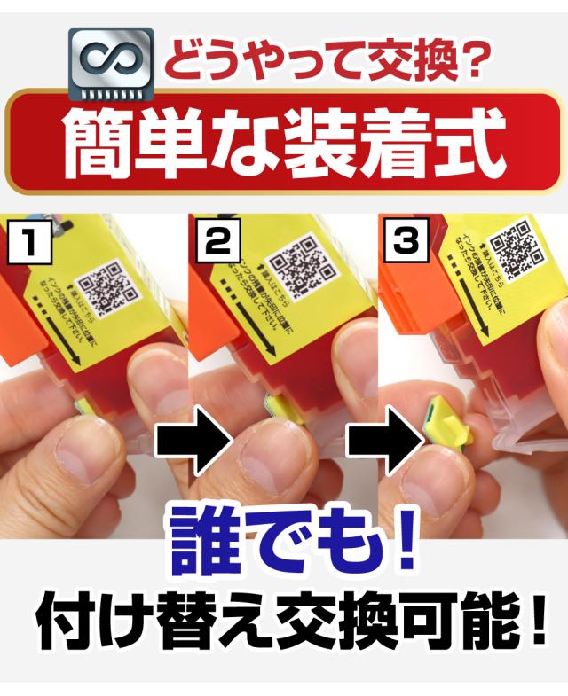 商品の特性:繰り返し使える永久ICチップ付きの互換インクカートリッジです。 インクが無くなった際は、インクボディのみ(ICチップなし)を追加でご購入いただき、 永久ICチップを付け替えることで、ご使用いただけます。