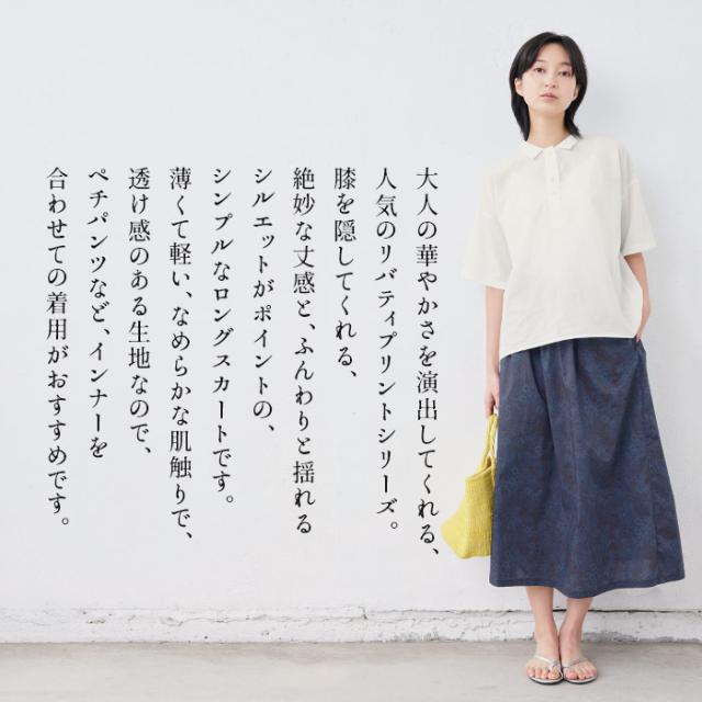 特徴 大人の華やかさを演出してくれる、人気のリバティプリントシリーズ。膝を隠してくれる、絶妙な丈感と、ふんわりと揺れるシルエットがポイントの、シンプルなロングスカートです。薄くて軽い、なめらかな肌触りで、透け感のある生地なので、ペチパンツなど、インナーを合わせての着用がおすすめです。