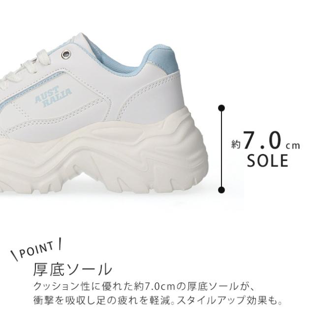 クッション性に優れた約7.0cmの厚底ソールが、衝撃を吸収し、足の疲れを軽減