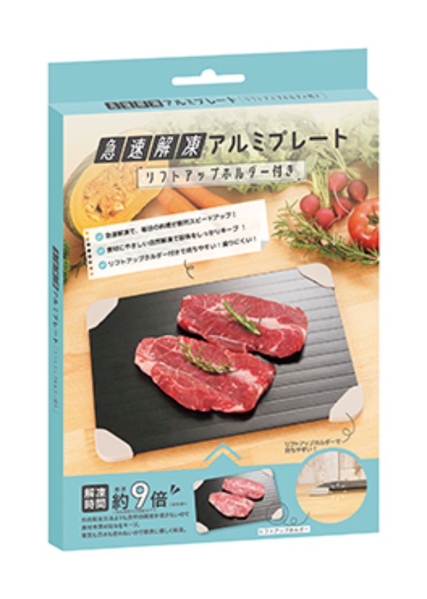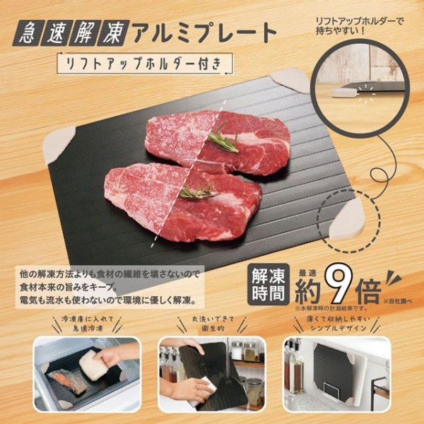 解凍プレート 解凍 冷凍 食材 解凍皿 自然解凍 急速解凍 粗熱取り リフトアップ 時短 冷却 アルミ ドリップ 時短 肉 魚 野菜 冷凍食品 調理 お弁当 失敗しにくい 美味しく仕上がる 便利雑貨 急速解凍 アルミプレート リフトアップホルダー付き